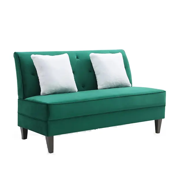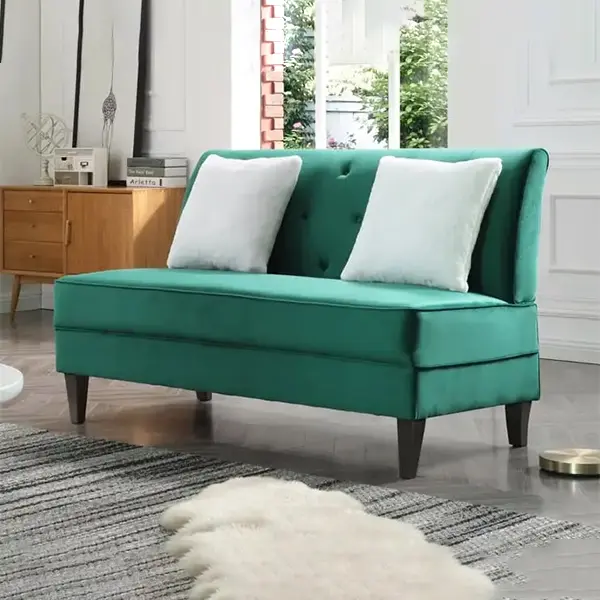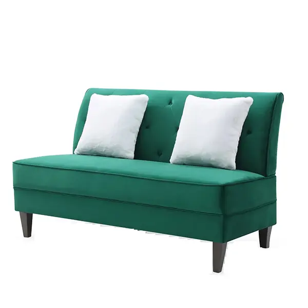 The Armless 2 Seater Sofa can accommodate two individuals. Ideal for small spaces or situations requiring accent chairs. Features include a tight back with button tufting, two throw cushions with contrasting velvet upholstery, tapering legs, and a welted trim for strong seams. It is available in a variety of colors. This piece is exquisitely crafted in every detail, making it the ideal addition to your living space without breaking the bank.