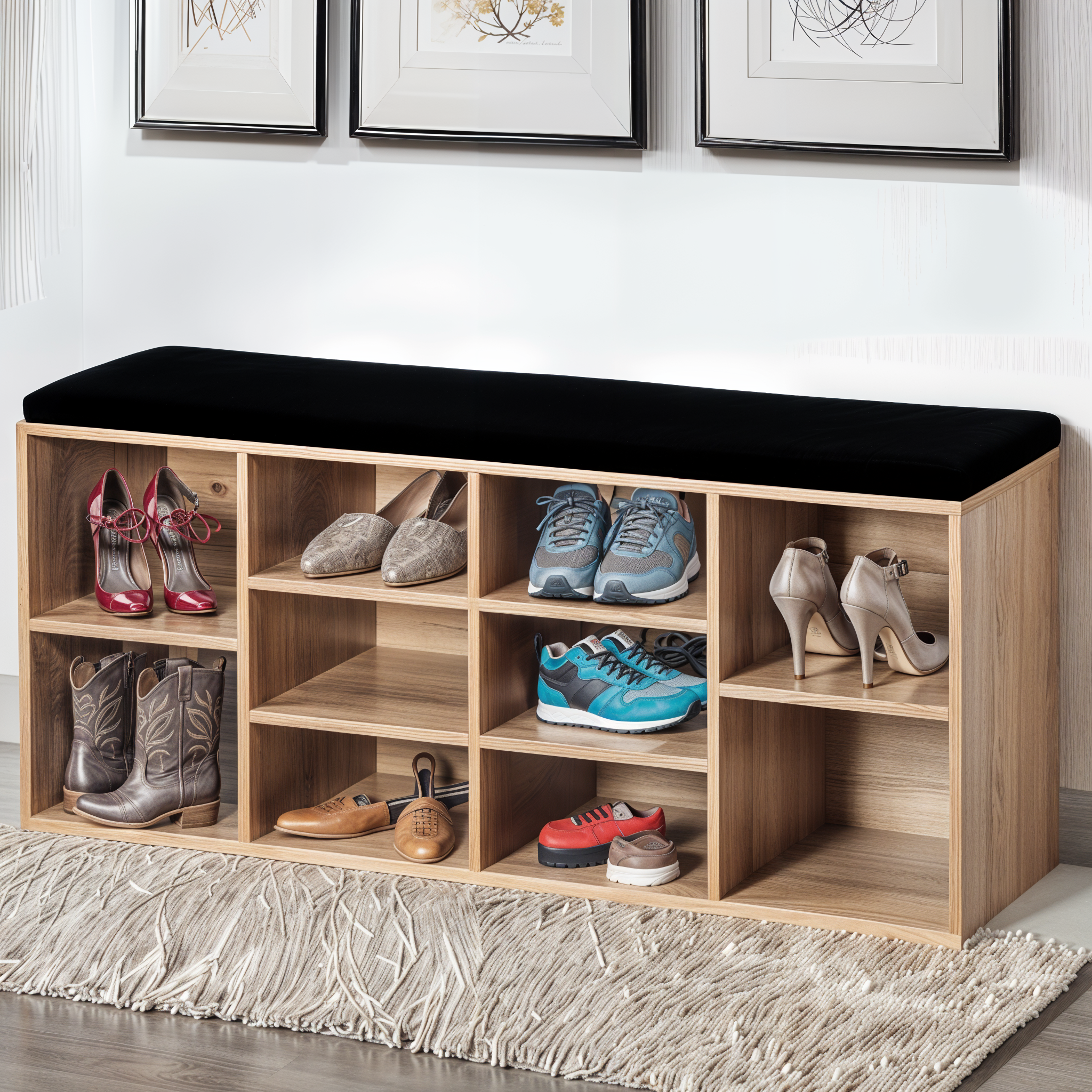 Combine comfort and functionality with the Shoe Haven with Seating, a smart storage solution designed for modern homes. Featuring a cushioned top for comfortable seating and multiple compartments for organized shoe storage, it keeps your entryway neat and stylish. Perfect for quick shoe changes and everyday convenience.