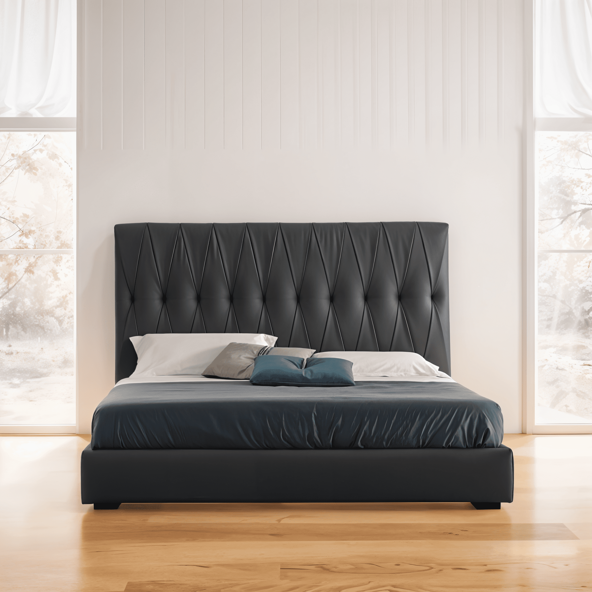 - The unique headboard design creates a modern focal point.